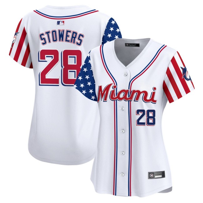 - Women's Miami Marlins #28 Kyle Stowers Nike White 2025 Independence Day MLB Baseball Limited Jersey - All Stitched