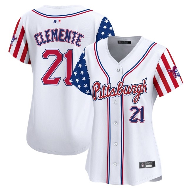 - Women's Pittsburgh Pirates #21 Roberto Clemente White 2025 Independence Day Limited Stitched Baseball Jersey