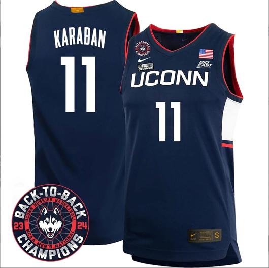 - Men's Alex Karaban Jersey #11 UConn Huskies Basketball 2024 Back To Back Champions Patch White